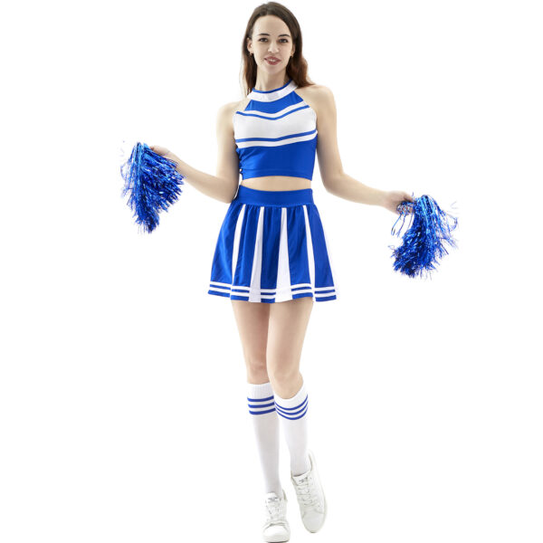 The cheerleader uniform set features a well-fitted top that complements the pleated skirt beautifully. The tops are made from breathable fabric, ensuring ease of movement and comfort. The pleated skirts are designed to offer a sleek and polished look while allowing for dynamic motion. Both the tops and skirts are available in various colors and sizes to cater to different team requirements.